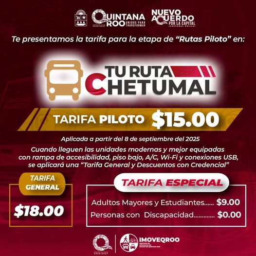 El Instituto de Movilidad de Quintana Roo informó a la ciudadanía que, a partir de este lunes 8 de septiembre, el transporte urbano Ruta Caribe en Chetumal tendrá una tarifa de $15 pesos por usuario.